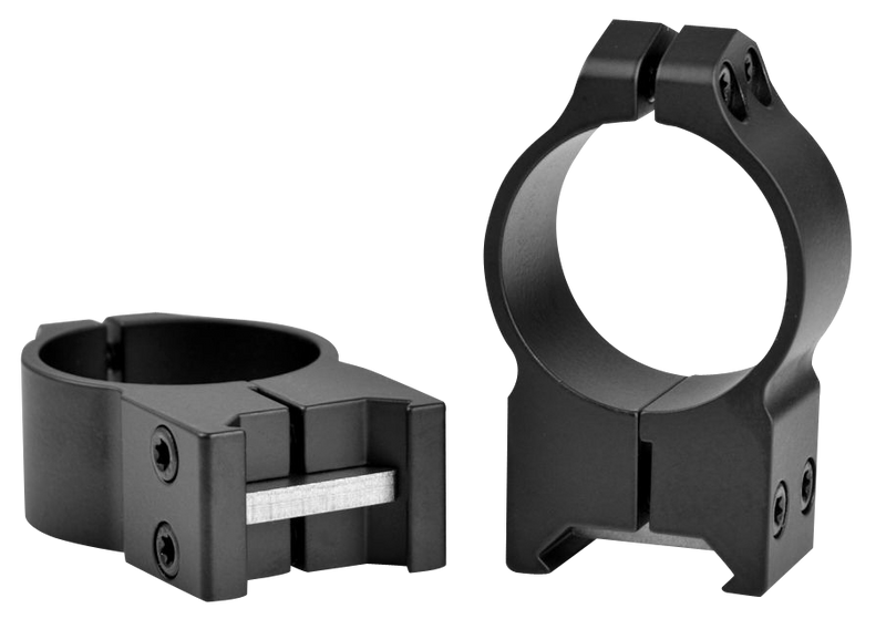 These Warne Maxima 30mm High rings are 2-piece vertical split rings designed for Picatinny/Weaver style bases. They feature a square recoil control key for positive engagement and are secured with four Torx T-15 socket cap screws, offering steel construction with matte black finish.