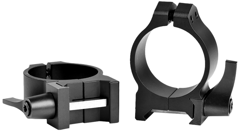 Warne Maxima Quick Detach ring set designed for 30mm scope tubes with low height and matte black finish. These steel rings mount on Weaver and Picatinny dimension bases and feature quick detach functionality for easy scope removal and remounting.