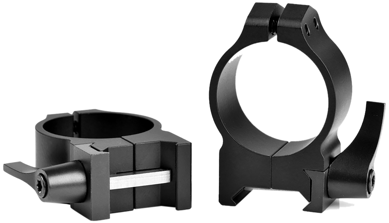 Warne Maxima Quick Detach Scope Rings are designed for 30mm tubes and feature a medium height profile with matte black finish. These 2-piece rings mount on Weaver and Picatinny rails, manufactured from steel using the same forging process used by Porsche and BMW, with a powder coating finish comparable to Zeiss and Nikon scopes.