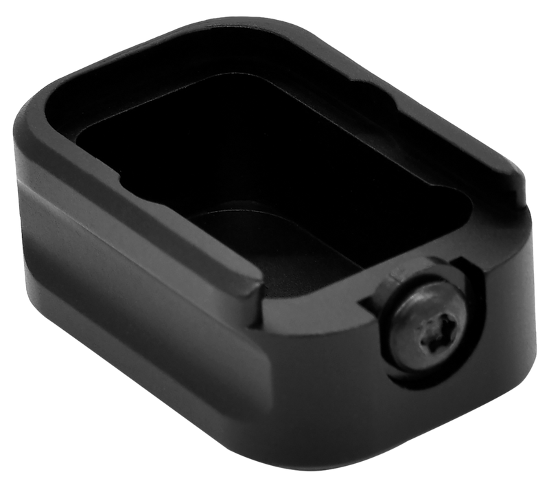 This aluminum magazine extension fits Glock 19 and Glock 23 magazines, adding 3 rounds for 9mm Luger or 2 rounds for .40 S&W. Constructed from 6061-T6 aluminum with a hardcoat anodized black finish for durability and corrosion resistance.