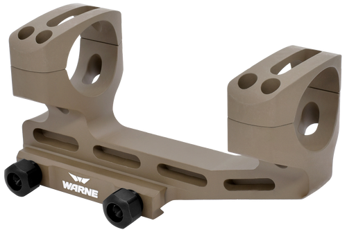 This Warne Quick Detach cantilever mount features a 34mm tube diameter and is constructed from 6061 T6 aluminum with steel threaded inserts for a lightweight yet rigid foundation. The skeletonized design reduces weight while maintaining return-to-zero performance, and the extended cantilever provides proper cheek weld height for AR-platform rifles with modern optics.