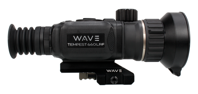 The Wave Tempest 660D is a fixed 3.4x magnification thermal imaging scope with a 60mm objective lens and illuminated multi reticle system. It features 640x512 resolution with 12-micron thermal sensor, 50 Hz refresh rate, and digital zoom up to 13.6x with rapid/smooth options. The scope includes an integrated laser rangefinder (LRF), offers a field of view of 380-1170 ft @ 1000 yards, and runs on 18650 Li-ion rechargeable batteries with 13+ hours of battery life.