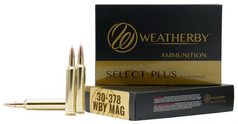 Weatherby Select Plus ammunition in 30-378 Weatherby Magnum with 180-grain Barnes Tipped TSX lead-free bullets delivers 3,325 feet per second muzzle velocity and 4,419 foot-pounds of energy. This premium hunting round pairs Weatherby's magnum case design with Barnes' proven bullet technology for flat-shooting, hard-hitting performance. Packaged 20 rounds per box, 10 boxes per case.