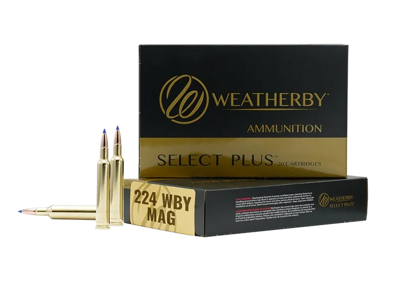 Weatherby 224 WBY Mag centerfire rifle ammunition loaded with 50gr Hornady V-Max bullets. This high-velocity varmint round delivers exceptional downrange energy and precision, capable of exceeding 4,125 fps from factory rifle loads. Packaged 20 rounds per box, 10 boxes per case.