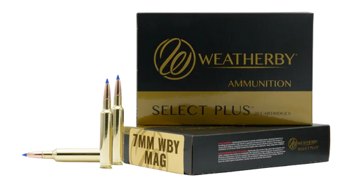 Weatherby Select Plus ammunition in .257 WBY Mag with 92-grain Hammer Custom bullets. This flat-shooting cartridge delivers 3570 fps muzzle velocity and 2830 ft-lbs of energy, loaded in brass cases with 20 rounds per box.