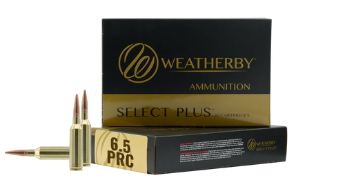 Weatherby Select Plus ammunition in 300 PRC caliber featuring a 195-grain Hammer Custom bullet. This centerfire rifle ammunition delivers a muzzle velocity of 2950 fps and muzzle energy of 3768 ft lbs, packaged in 20-round boxes with 10 boxes per case.
