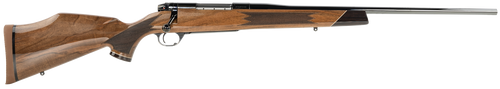 The Weatherby Mark V Deluxe is a bolt-action rifle chambered in 25 Creedmoor with a 22" non-threaded barrel and 4+1 capacity. Features include a high gloss blued steel receiver drilled and tapped for optics, gloss walnut fixed stock, TriggerTech trigger, and Accubrake ST muzzle brake. This right-hand rifle weighs 7 lbs with an overall length of 42.63" and a 1:7.5" twist rate.
