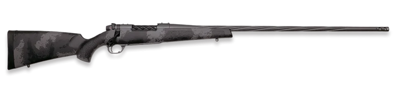 The Weatherby Mark V Live Wild is a bolt-action rifle chambered in 270 Winchester with a 24" spiral fluted barrel and 4+1 capacity. Features include a TriggerTech trigger, muzzle brake, drilled and tapped receiver, and a carbon fiber stock with black and gray accents. This rifle weighs 5.8 lbs and measures 45" overall with a 1-in-10" twist rate.