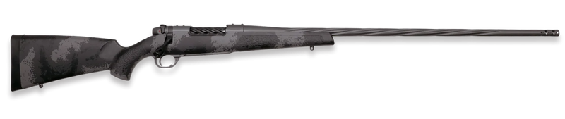 The Weatherby Mark V Live Wild is a 7mm Rem Mag bolt-action rifle featuring a 26" spiral fluted threaded barrel with Accubrake ST muzzle device. Built on Weatherby's historic Mark V action with a TriggerTech adjustable trigger, skeletonized bolt knob, and drilled/tapped steel receiver. Finished in graphite black Cerakote with a carbon fiber reinforced black and gray polymer stock, weighing 6.9 lbs with 3+1 capacity.
