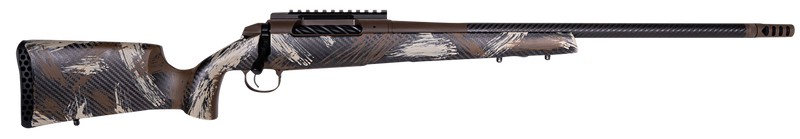The Weatherby 307 Alpine CT is a bolt-action rifle chambered in .300 Winchester Magnum with a 22" threaded carbon fiber barrel and 3+1 capacity. It features a Carbon Fiber Peak 44 Bastion stock with chocolate brown Cerakote finish, directional self-timing muzzle brake, TriggerTech trigger, Picatinny rail, and weighs 6.1 lbs with a 44" overall length. The rifle is drilled and tapped with a SUB-MOA accuracy guarantee.