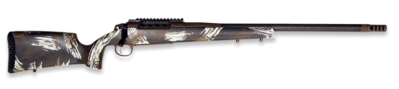 The Weatherby Model 307 Alpine CT is a bolt-action rifle chambered in .308 Winchester with a 20" threaded carbon fiber barrel and 2" muzzle brake. It features a carbon fiber Peak 44 Bastion stock with chocolate brown Cerakote finish, Picatinny rail for optics, and weighs 6 lbs. The rifle includes a TriggerTech Field trigger and has a magazine capacity of 4+1 rounds.