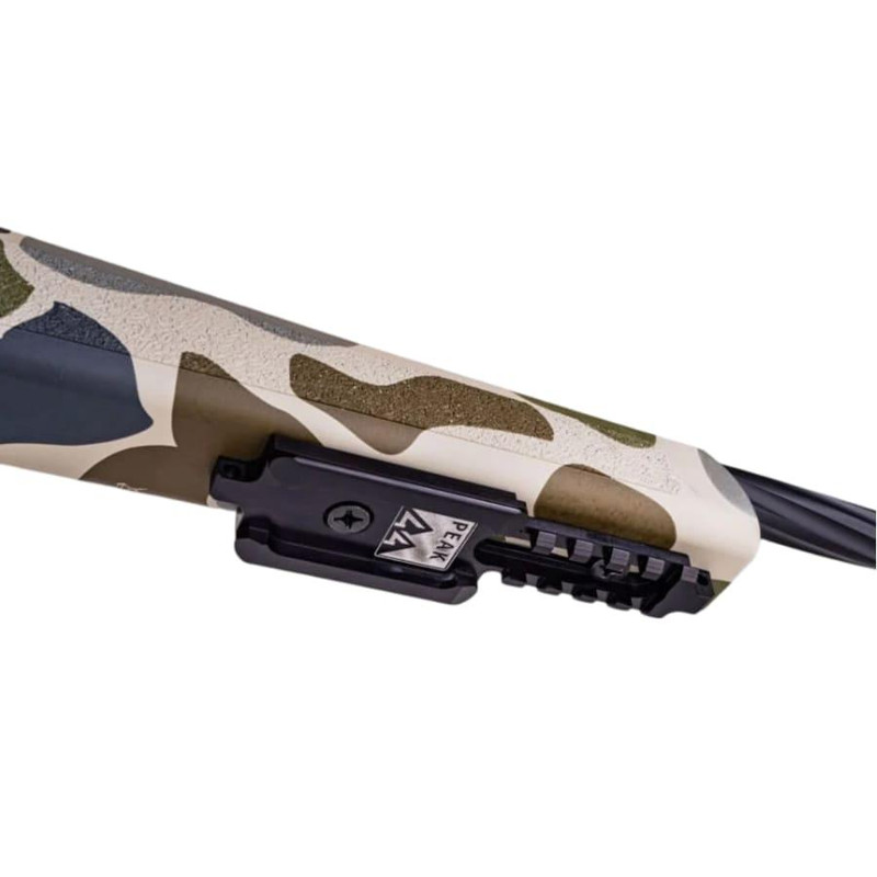 The Weatherby Model 307 Hush is a bolt-action rifle chambered in 6.5 Creedmoor with a 22" threaded barrel and 5-round magazine capacity. It features a fluted receiver and bolt with graphite black Cerakote finish, hydrodipped HUSH Tundra camo synthetic stock, Peak 44 Picatinny rail system, and Magpul bottom metal. The rifle weighs 7.3 lbs, has an overall length of 41.5", and includes 1/2-28 threaded barrel for suppressor compatibility.