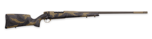 The Weatherby Mark V Weathermark LT is a 6.5 WBY RPM bolt-action rifle with a 24" fluted barrel and 4+1 capacity, weighing just 5.9 pounds for backcountry use. It features a Flat Dark Earth Cerakote finish on stainless steel metalwork, a hand-laid fiberglass Monte Carlo stock with aluminum bedding blocks, and a TriggerTech Field trigger. The spiral-fluted bolt body and #2 contour barrel reduce weight while maintaining sub-MOA accuracy and are topped with a Weatherby Accubrake muzzle device.