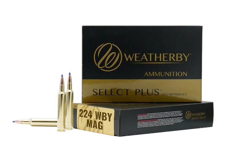 Weatherby Select Plus 224 WBY Mag ammunition features 80.5 grain Berger hollow point boat tail projectiles loaded in brass cases. This factory round delivers high-velocity performance exceeding 2900 feet per second, designed for varmint and predator hunting with exceptional downrange energy and precision.