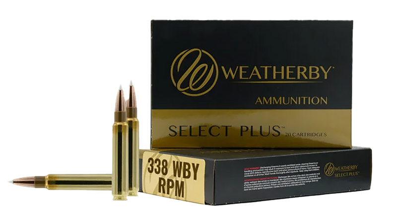 Weatherby Select Plus ammunition in 338 WBY RPM caliber with 185-grain Barnes TTSX bullets. This lead-free, reloadable brass-cased ammunition delivers 3100 fps muzzle velocity and 3947 ft-lbs of energy, designed for the lightweight Mark V 6 Lug action to take down North American big game.