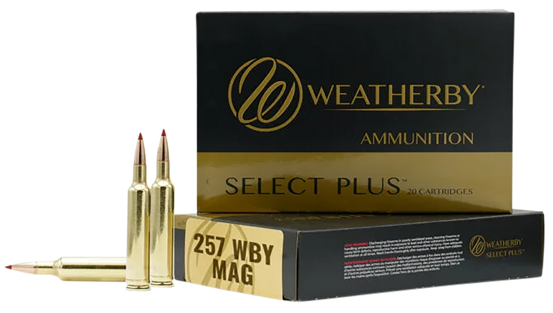 Weatherby Select Plus ammunition in 257 Weatherby Magnum with Hornady ELD-X 110-grain bullets delivers 3400 fps muzzle velocity and 2823 ft-lbs of energy. Designed for long-range hunting with a flat trajectory suitable for big game applications. Packaged 20 rounds per box with 10 boxes per case, brass casing.