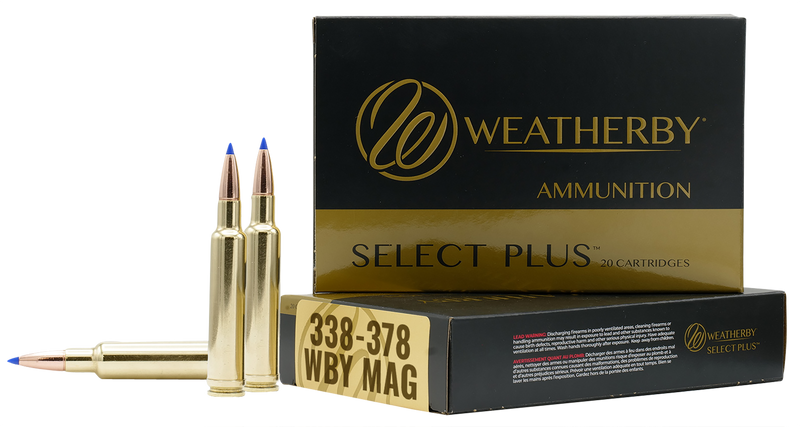 Weatherby Select Plus rifle ammunition in 338-378 WBY Magnum with a 225-grain Barnes Tipped TSX lead-free bullet. Delivers 5052 ft-lbs of muzzle energy at 3180 fps, designed for long-range big game hunting with excellent accuracy and flat shooting trajectory. Comes in 20-round boxes with 10 boxes per case.