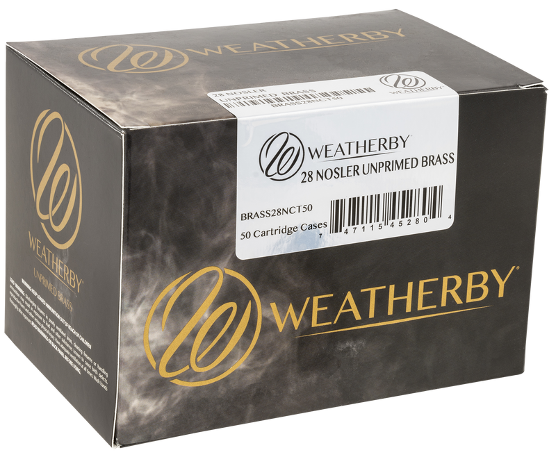 Weatherby unprimed brass rifle cartridge cases for 28 Nosler caliber, packaged 50 per box. Cases feature CNC-machined primer pockets and meet strict grade specifications for reloading. Cases require sizing, deburring, and chamfering before use due to potential mouth irregularities from manufacturing or shipping.