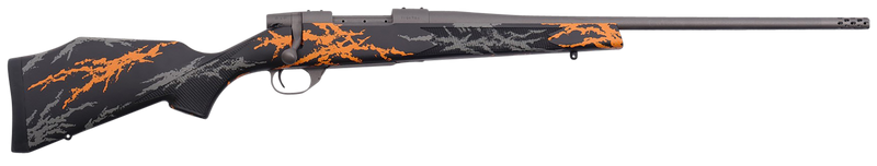 The Weatherby Vanguard Compact Hunter is a bolt-action rifle chambered in 7mm-08 Remington with a 20" tungsten gray Cerakote barrel and threaded muzzle brake. It features a black synthetic Monte Carlo stock with gray and orange sponge accents, adjustable two-stage trigger, and 5+1 round capacity, weighing 6.5 lbs and offering sub-MOA accuracy with length-of-pull adjustability for youth and compact shooters.