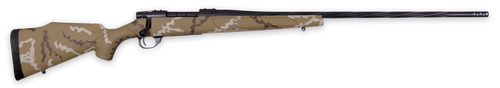Weatherby Vanguard Outfitter bolt-action rifle chambered in 300 Win Mag with a 26" fluted and threaded barrel, 3+1 capacity, and two-stage trigger. Features a tan synthetic Monte Carlo stock with brown and white sponge paint, black Cerakote finish, Accubrake muzzle brake, and weighs 7.25 lbs. Built on Weatherby's proven Vanguard action with integral recoil lug and drilled/tapped steel receiver.