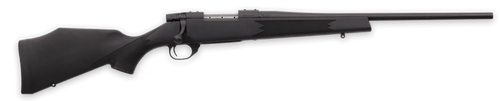The Weatherby Vanguard Synthetic Compact is a bolt-action rifle chambered in 223 Rem with a 20" matte blued threaded barrel and 5+1 capacity. It features an adjustable two-stage match trigger, drilled and tapped steel receiver, and black synthetic stock with Griptonite grip, weighing 6.5 lbs. This compact rifle is guaranteed to shoot sub-MOA and includes stock spacers for fit adjustment.