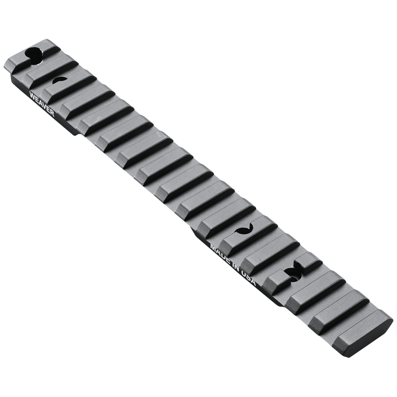 This Weaver 1-piece extended multi-slot base is designed for Remington 700 short action rifles and provides an additional 1 inch of forward length for enhanced mounting options. Constructed from 6061-T6 aluminum with a matte black anodized finish, it features Picatinny compatibility, an integral recoil lug, and no-slip torx screws for secure installation.