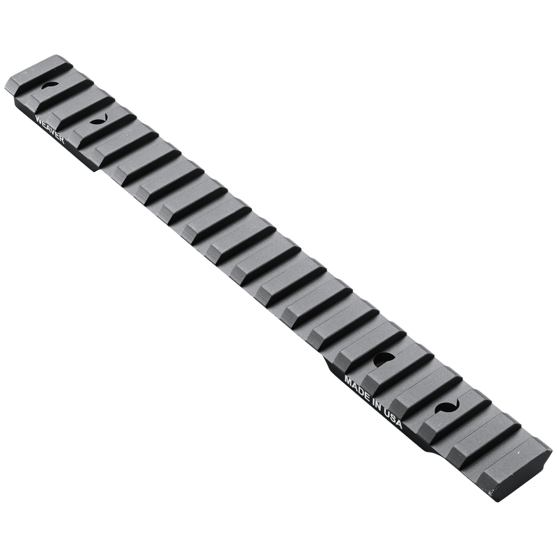 This 1-piece extended scope base from Weaver fits Savage 110/111/112/114/116 long action rifles and provides an additional 1 inch of forward length for enhanced mounting options. Constructed from 6061-T6 aluminum with a matte Type III hard coat anodized finish, it features an integral recoil lug and Torx screws. Compatible with both Picatinny and Weaver style scope rings.