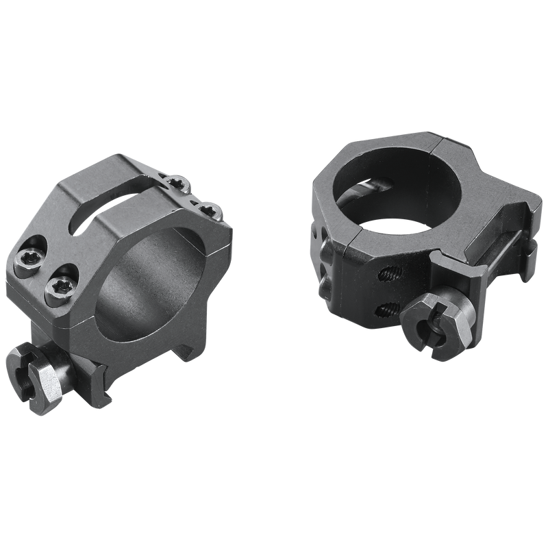 These Weaver Four-Hole Skeleton Rings feature a 1" tube diameter in medium height and matte black finish. The rings utilize Weaver's Cross-Lock design with aircraft-grade 6061 T6 aluminum construction and no-strip/no-slip Torx screws for secure scope mounting on Weaver or Picatinny rails.