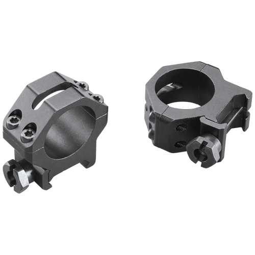 Weaver's Four-Hole Skeleton Rings are designed to mount 30mm scopes on Picatinny/Weaver-style rails. These matte black aluminum rings feature the Cross-Lock design with no-slip, no-strip Torx screws for secure mounting. Available in high height, they are constructed from aircraft-grade 6061 T-6 aluminum and made in the USA.