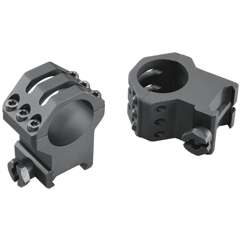 Two-piece scope rings designed for Picatinny rail systems with 1" tube diameter and extra-extra high height. Features six screws for maximum security and clamping pressure, Type III hardcoat anodized matte black finish, and no-strip/slip Torx screws for tactical and precision rifle applications.