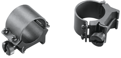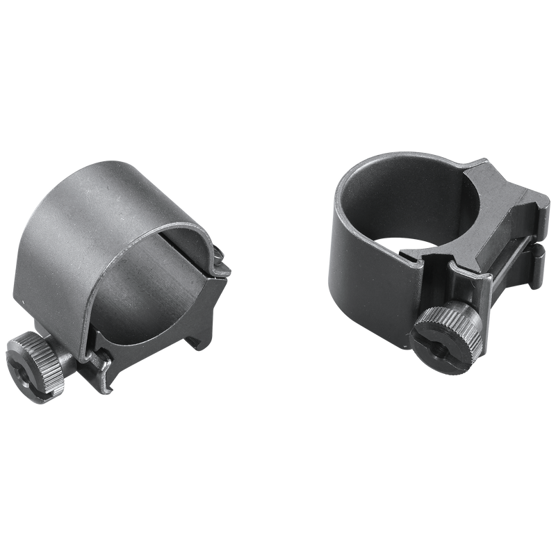 Weaver Detachable Top Mount Rings feature a 1" tube diameter with medium height and matte black finish. These two-piece aluminum rings with steel reinforcement straps provide quick-detach capability, allowing you to remove and remount your scope by simply loosening two thumb nuts while maintaining zero.