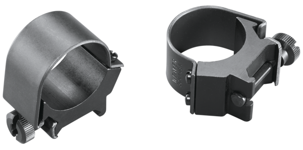 These Weaver detachable top mount rings feature a 30mm tube diameter and are designed for quick removal and remounting. The aluminum saddle construction with steel reinforcement reduces weight while maintaining strength, and the low profile design allows for quick return to iron sights by loosening thumb nuts.