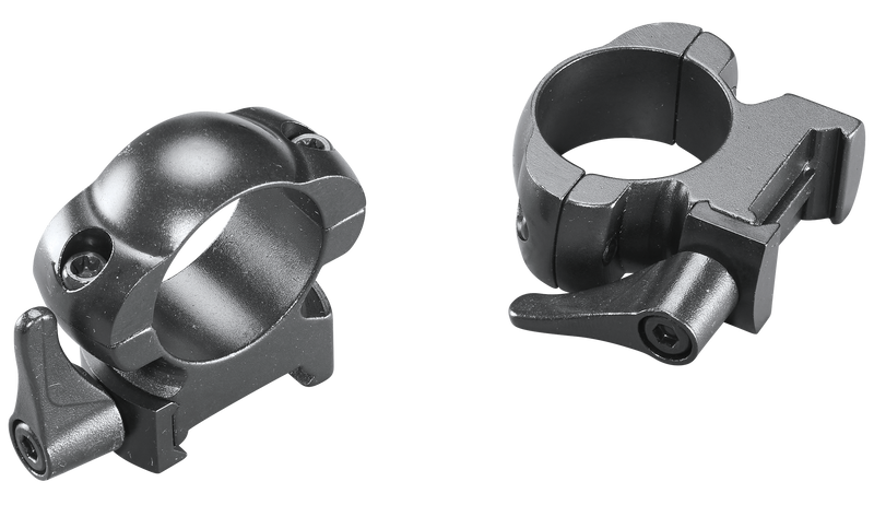 These Weaver Grand Slam Lever Lok top mount rings are designed for 1" diameter scope tubes and feature a 2-piece steel construction with matte black finish. The lever lock mechanism allows tool-free attachment and detachment using only your thumb, while maintaining secure scope support. Manufactured from Grand Slam steel with a limited lifetime warranty.