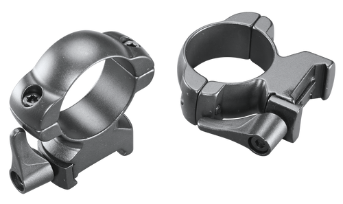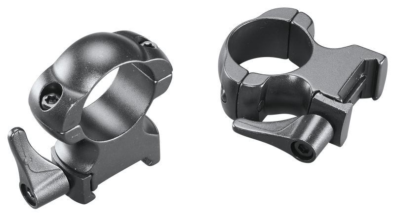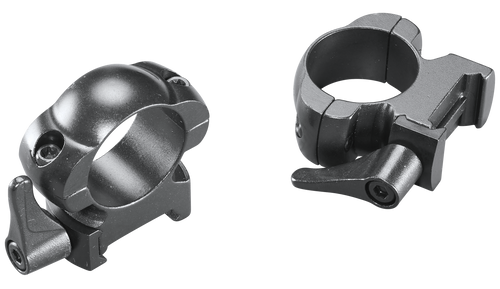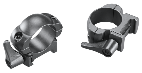 These Weaver Lever Lok rings are 2-piece, top-mount scope rings designed for 1" tube diameter scopes in extra high height. Featuring a cross-lock design with quick-detach capability, the rings attach and detach without tools using thumb screws, making them convenient for hunters and shooters who frequently transport their firearms. Constructed from solid steel with matte black finish and manufactured in the USA.