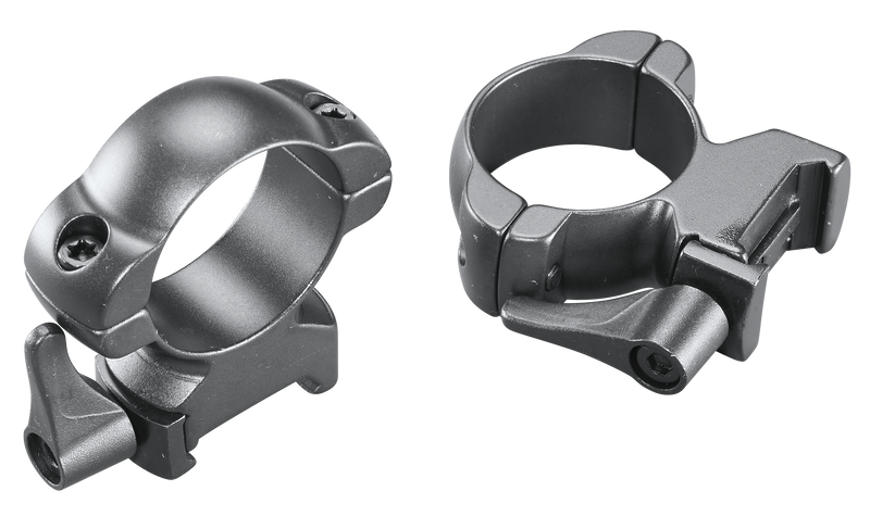 Two-piece Weaver-style scope rings designed to secure 30mm diameter tubes with a high ring height. Features a cross-lock design with quick-detach capability and tool-free thumb screw operation for easy attachment and removal. Made from solid steel construction with matte black finish.