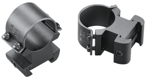 Two-piece Weaver-style scope rings with 1" tube diameter and extra-high mounting height for versatile scope positioning. Features windage adjustment capability, four-hole design with Torx screws, and Weaver's cross-lock design for secure scope retention. Made of solid steel with matte black finish and manufactured to exact tolerances in the USA.