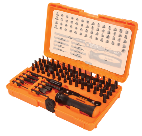 A comprehensive gunsmithing tool kit designed to convert a workbench into a professional gunsmithing station. The kit includes essential tools for tasks such as mounting accessories, punching out pins, replacing triggers, and separating stocks from receivers, plus an array of bits, punches, driver, and hammer.