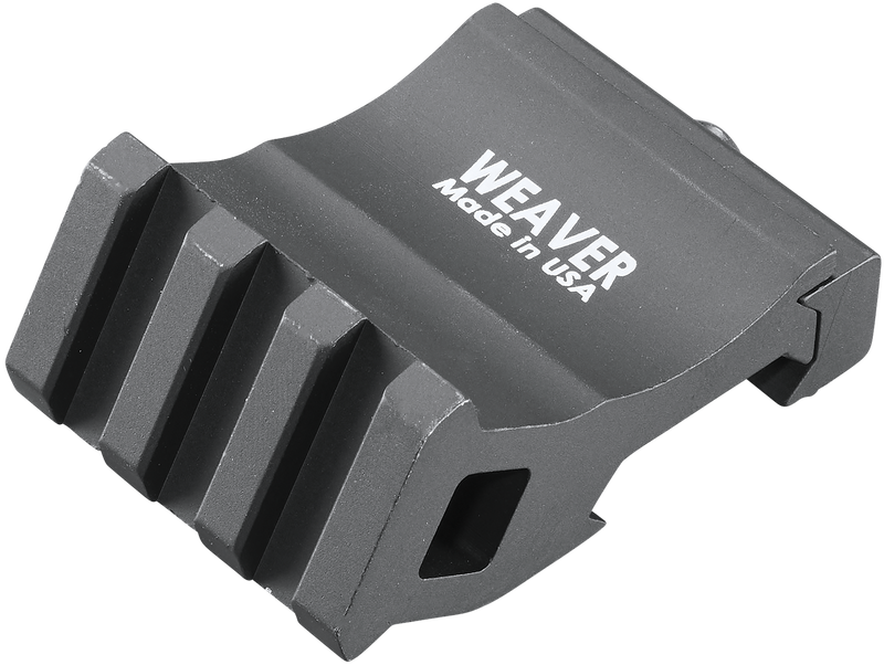 The Weaver Offset Rail Adapter is a single-piece aluminum mounting solution that attaches to any Picatinny rail to enable offset mounting of red dot sights, lights, or other accessories without requiring a head shift. Made from 6061-T6 aluminum with matte black anodized finish, it measures 4.6" in length and 1.2" in height, providing a lightweight yet rigid platform for tactical configurations.