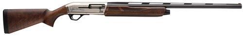 Left-hand semi-automatic shotgun chambered in 12 gauge with 3" chamber and 26" barrel. Features a matte nickel-plated receiver with scroll engraving, Grade II/III Turkish walnut stock with satin oil finish, and includes three Invector-Plus choke tubes (F, M, IC). Equipped with TruGlo fiber-optic front sight, Inflex Technology recoil pad, and 3+1 capacity; weighs 7 lbs.