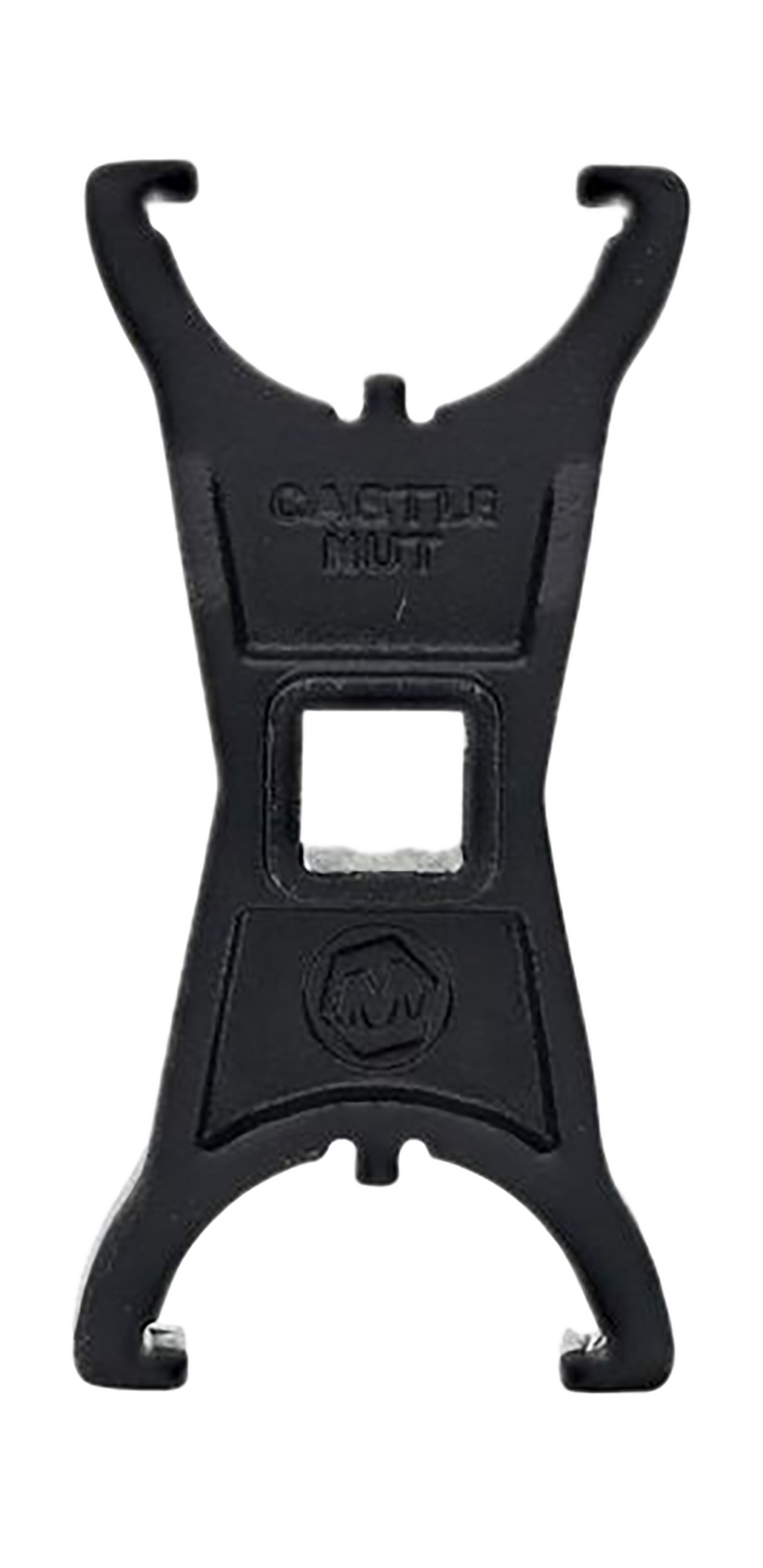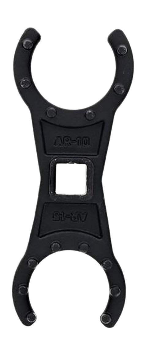 The Wheeler Castle Nut Crowfoot Wrench is a black steel gunsmithing tool designed for installing and removing castle nuts on rifle buffer tubes and similar components. This precision tool features crowfoot wrench geometry for efficient torque application in tight spaces. Dimensions are 9.1" length x 4.2" width x 1.2" height.