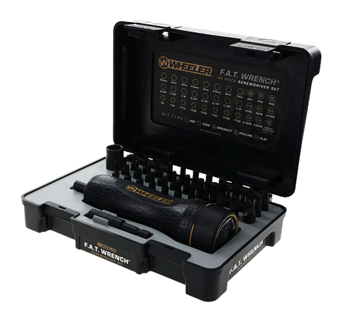 This compact 36-piece screwdriver set includes a ¼" drive handle with texturized rubber grip and magnetized tip, along with assorted SAE, Metric, Hex, Torx, Phillips, and Flat bits for general maintenance tasks. The bits are coated in black phosphate to prevent rust and come organized in a molded hard case. Designed for convenient storage in range bags, vehicles, and other compact spaces.