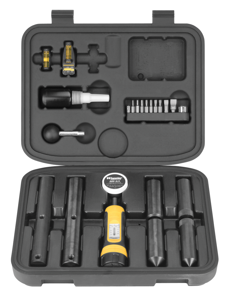 Complete gunsmithing kit for mounting 1-inch or 30mm scopes with proper alignment and lapping. Includes F.A.T. torque wrench, lapping bars, alignment bars, lapping compound, thread lock, 10 screwdriver bits, level, and instructional DVD. Ensures maximum surface contact between scope tube and rings for secure mounting and scope protection.