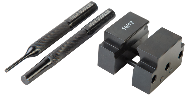This gunsmithing tool is designed to remove A2 style gas block taper pins from AR-platform rifles. The kit includes a support block, starter punch, and finishing punch made from durable tool steel, and works with both single and dual taper pin configurations. It can be used with a vise or ball peen hammer for quick and efficient pin removal.