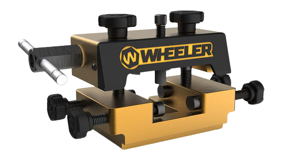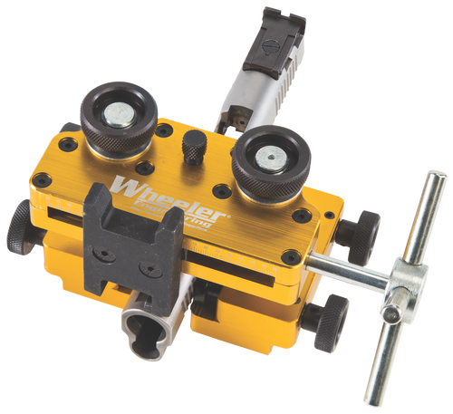 The Wheeler Universal Handgun Sight Tool is designed for adjusting, installing, or removing dovetail-style front and rear handgun sights. Made of high-end materials, it features four independent positioning clamps for a secure fit on subcompact, compact, full-size, competition, and 1911 slides. This tool works with all popular semi-auto pistols including Glocks, 1911s, and S&W models.