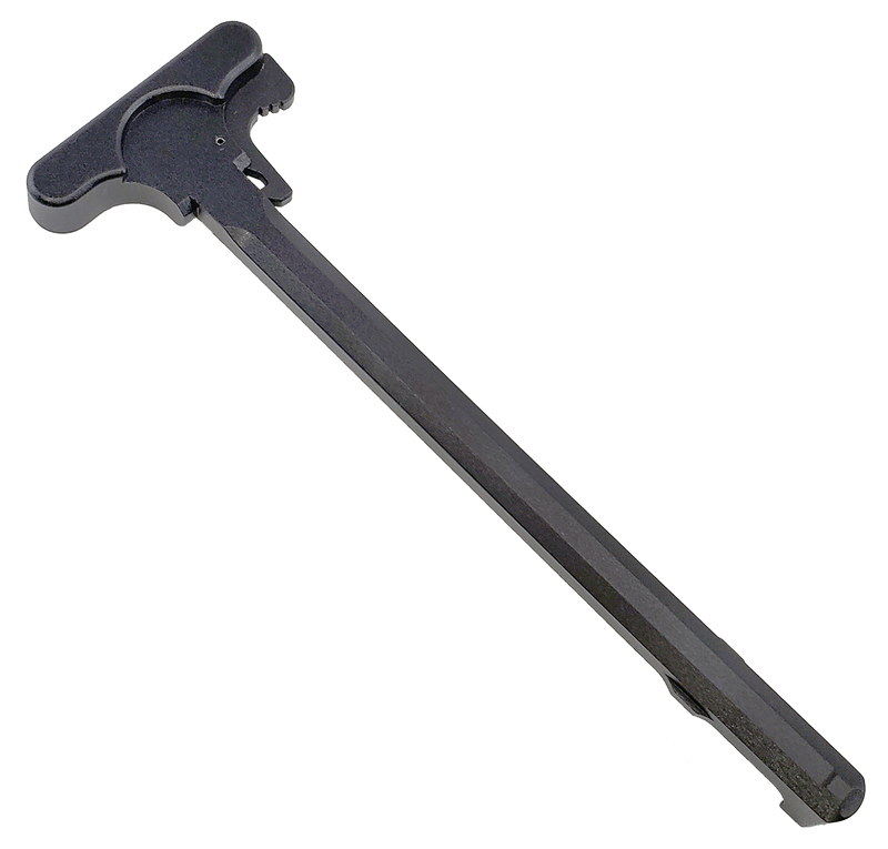 Forged aluminum charging handle designed for AR-15 rifles with black finish. This accessory provides reliable bolt carrier group manipulation during operation. Compatible with standard AR-15 platforms.