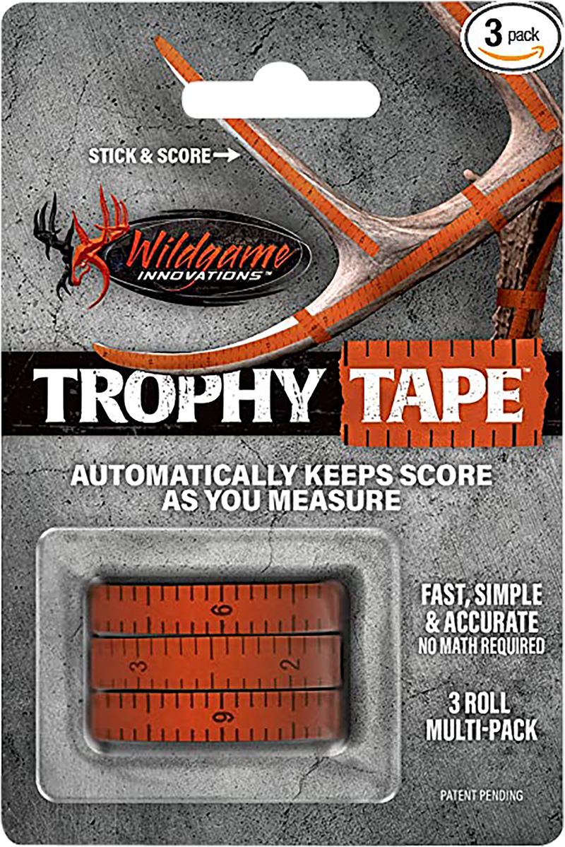 Wildgame Innovations Trophy Tape is a 200-inch orange measuring tape designed for hunters to record game measurements in the field. This pack contains 3 rolls of tape made from a blend material, measuring 3.9" wide. The bright orange color ensures visibility for marking distances and recording trophy dimensions during hunts.