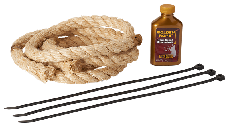 This kit includes three 30-inch natural fiber ropes with high absorption and durability, paired with 4 fl oz of Golden Rope scent concentrate that makes 20 fl oz of finished scent. The ropes are designed to be dipped in the scent and refreshed throughout the hunting season, with three cable ties included for easy setup.