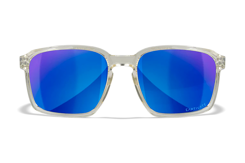 The Wiley X Alfa features polarized polycarbonate lenses with blue mirror coating and 100% UV protection, designed for shooting and outdoor activities. The frame is constructed from Triloid Nylon in a gloss clear crystal finish for durability and comfort. Medium/Large sizing provides a secure fit for extended wear during range or field use.