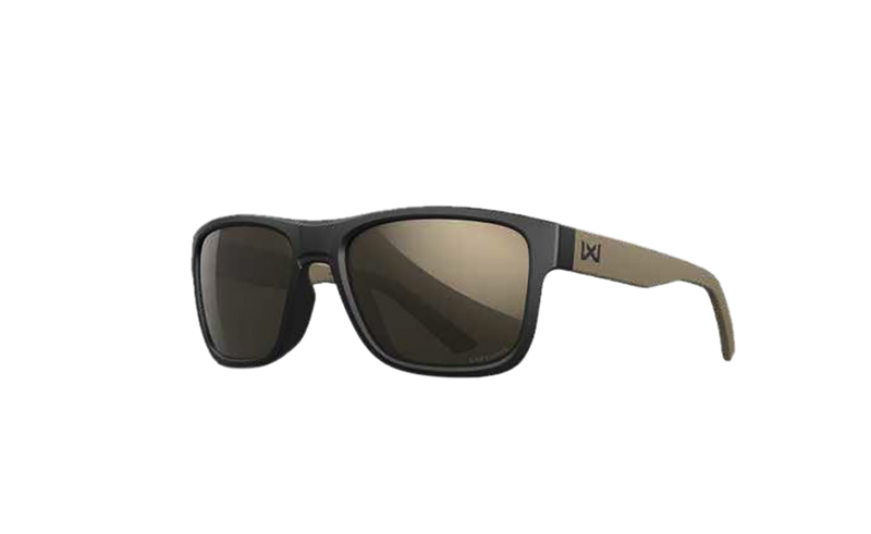 Wiley X Ovation shooting glasses feature polarized polycarbonate lenses with tungsten mirror coating and 100% UV protection for reduced glare and eye strain during outdoor shooting. The Triloid Nylon frame in matte black with tan accents provides a lightweight, durable fit. These glasses are designed for shooters and outdoor enthusiasts requiring ballistic-rated eye protection.