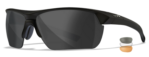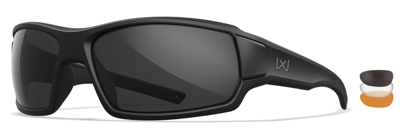 The Wiley X Breach 2.5 XL is an oversized tactical eyewear frame designed for shooting and outdoor sports. It features interchangeable lenses in gray, clear, and rust tints with matte black frame components for versatility in varying light conditions. The XL sizing accommodates larger face profiles while maintaining ballistic protection standards.
